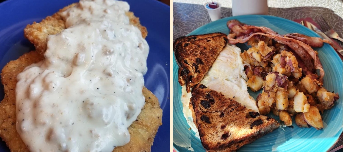 Some must-try dishes include the pancakes, meatloaf, and their famous breakfast burrito. For a snack, order the fried mozzarella or loaded nachos. Don't forget to try the homemade desserts!